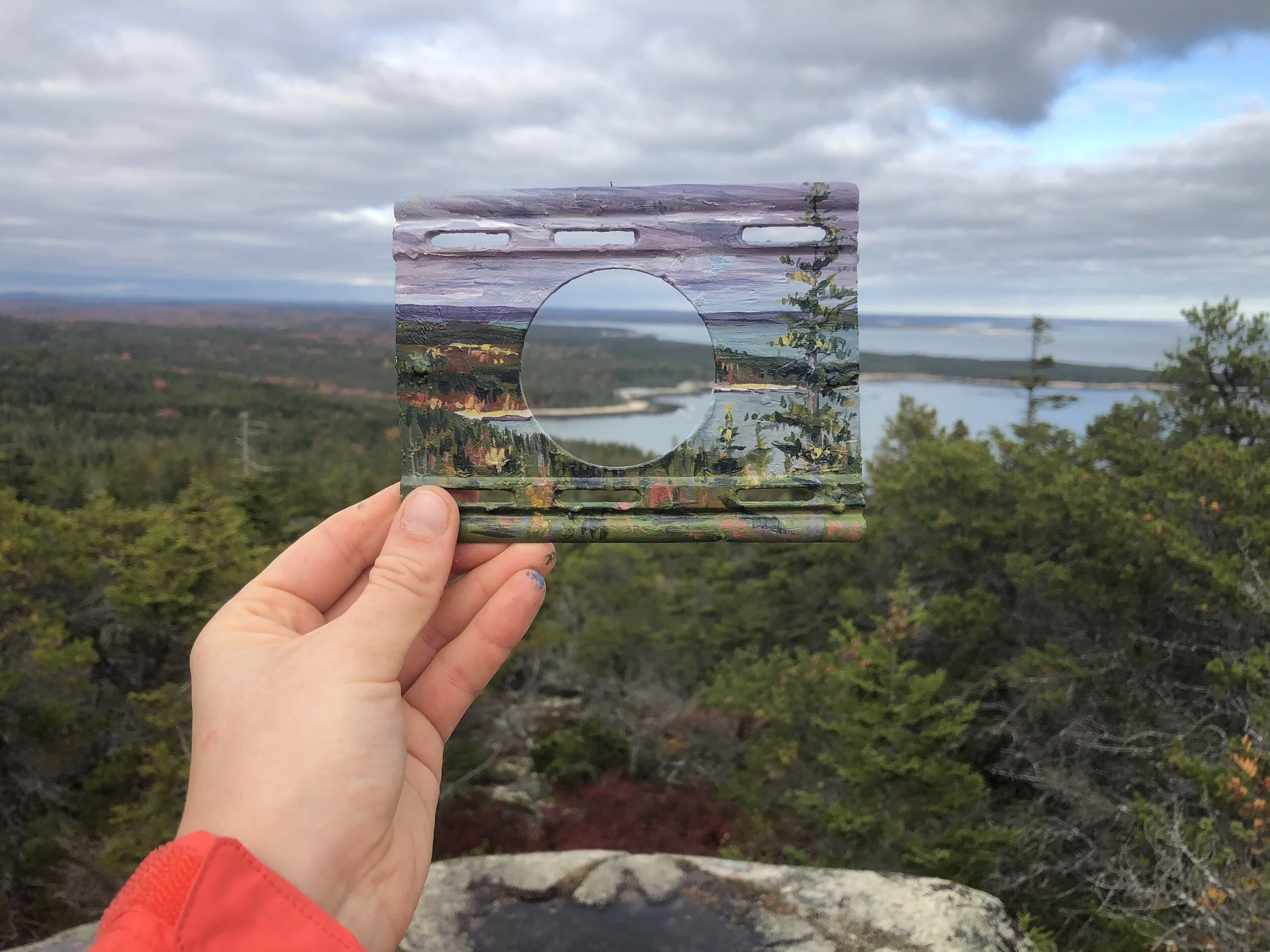 My happiness was overflowing. During this stint, my parents came to visit again! We walked along the ocean path in search of marine debris and found the largest piece yet! When I first saw the cracked aquaculture box, I had to double-take. The large, dark, bulky, geometric object completely blended in with the jagged coastline it was found in. One corner of the box was leaking styrofoam, so we basically had no option but to take it off the beach. I took a bunch of source images, and then my dad and I walked it across the rocky beach, shoved it up a muddy, rooted out slope, and rolled it across the street. We had to clear everything out of the trunk of the car, and the box barely squeezed in, but we got it! From there, I drove the piece home to Bangor, ME, and set up a studio in the dining room, used the electric sander, primed the piece three times, and was finally able to paint the landscape on top of it. I spent the winter at home working on completing this “Big Box” piece. In January, with the help of two friends, I was finally able to realign and photograph the box. It was SUCH a rewarding experience to see it within the landscape it was rescued from, and we timed it perfectly with the sun and the weather. Acadia is such a source of inspiration, and I feel very fortunate to have such access to it.